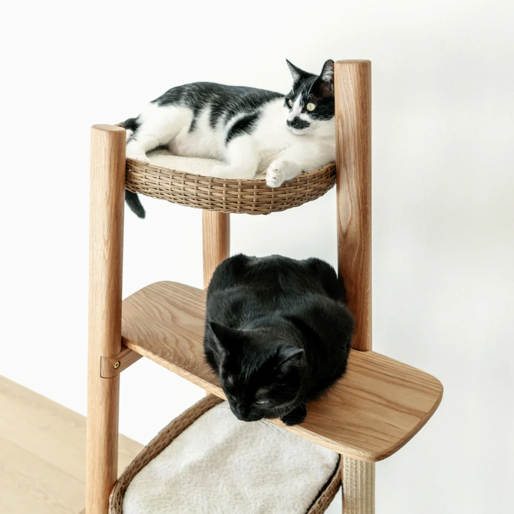 Designed with thoughtful precision, the Reiya offers a floating, staircase-like arrangement for your cat, promoting natural movement and engagement. Cozy, machine-washable cushions made from Oeko-Tex® performance fabric nestle comfortably within woven rattan baskets, while a cleverly angled replaceable scratching pad meets your cat’s scratching instincts with ease. With its vertically-oriented, space-conscious design, the minimalist Reiya maintains a light and open-air feel, making it well-suited even for smaller living spaces with single or multiple cats. A fusion of functional versatility and artistic appeal, the Reiya creates a luxurious experience for both cats and their owners.