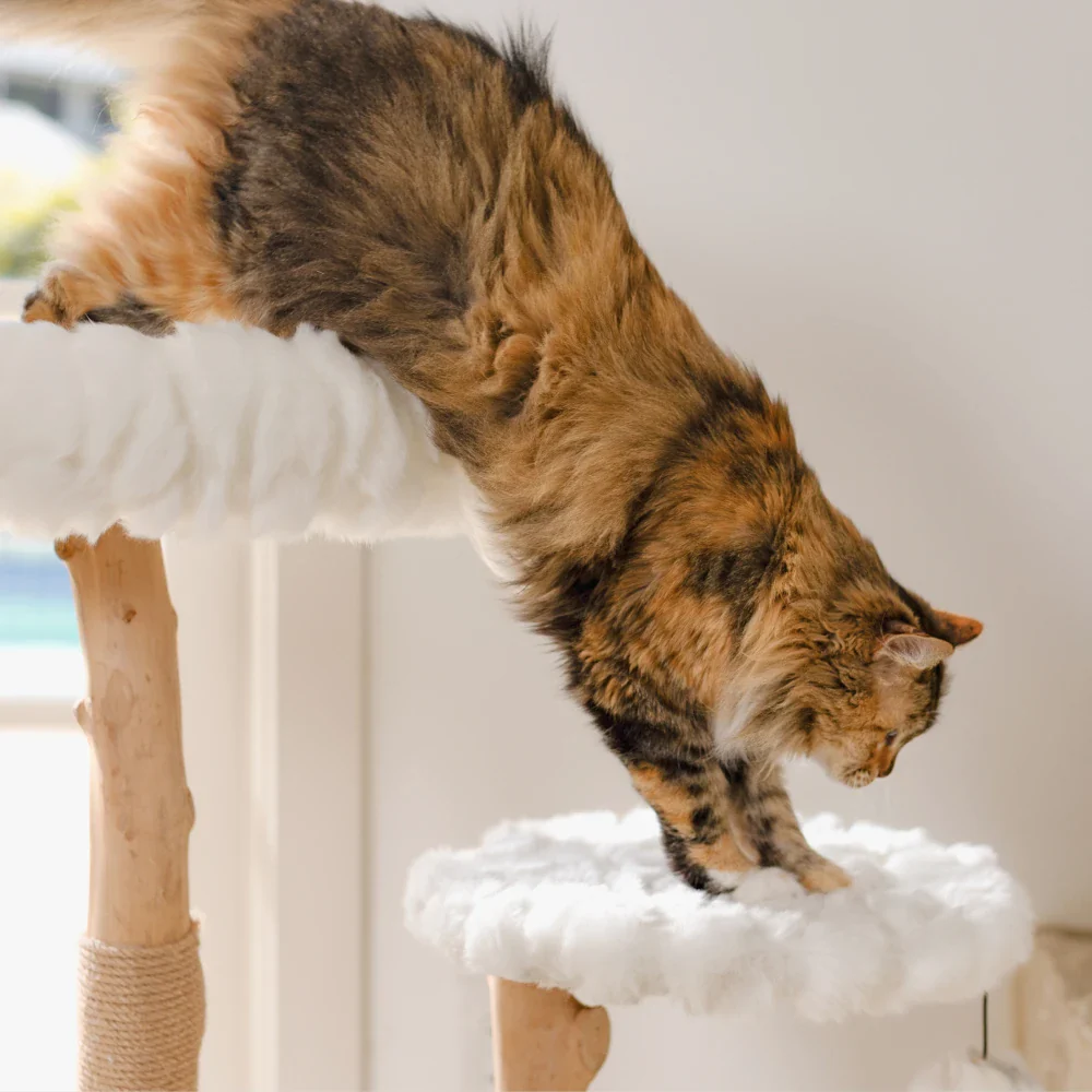 Naps are important but so is fun time, and there’s no reason a cat tree tower can’t provide both! Equally great for single or multi-cat households, the Rizzo comes with dual rest spots including a lower-level plush perch and a luxuriously fluffy cat bed just one foot higher on the upper level. Still, it’s the bells and whistles of this gem that make it a feline favorite. Made of real tree branches, properly treated for pet safety and long-term use indoors, this modern wood cat tree packs a playful punch with two sturdy scratching posts, a pom-pom toy, and a free-hanging 21.5-inch rope for irresistible fun. (By the way, don’t worry about using our valuable natural resources: We plant a new tree for every cat tree sold!)